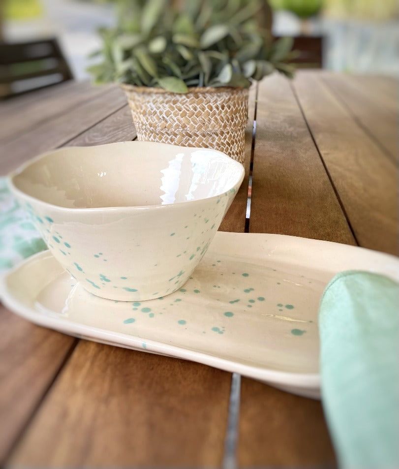 Presentamos una hermosa bandeja de cerámica, elaborada con esmero artesanal en España. Cada pieza es única, ya que se pinta a mano y presenta pequeñas imperfecciones que añaden un encanto singular a su diseño. Esta fuente redonda está hecha de loza, lo que la hace resistente y duradera, ideal para realzar la presentación de tus comidas en cualquier ocasión. Disponible en cuatro elegantes tonalidades: rose, aqua, gold y grey blue.